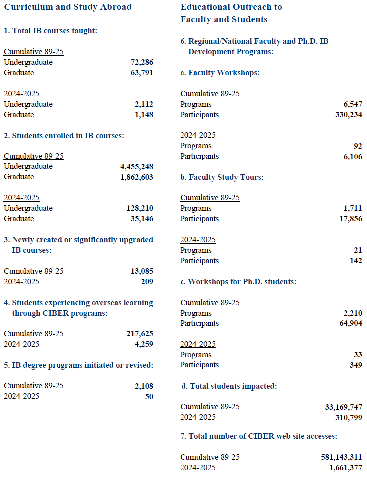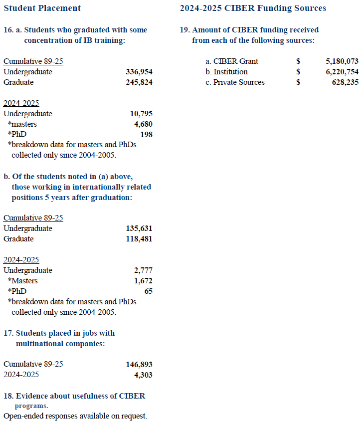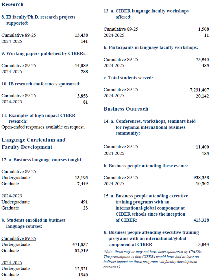 The Association of International Business Education and Research (AIBER) is an incorporated association representing the Centers for International Business Education and Research. Under AIBER auspices the University of Texas at Austin, CIBER collected data for the Annual CIBER Statistical Summary from 1989 to 2017 to demonstrate the impact of programs of the institutions funded by the CIBER grants. Data collection transitioned to the Indiana University CIBER in 2017. The current report shows data from the most recent academic year, as well as cumulative statistics for the program since 1989.